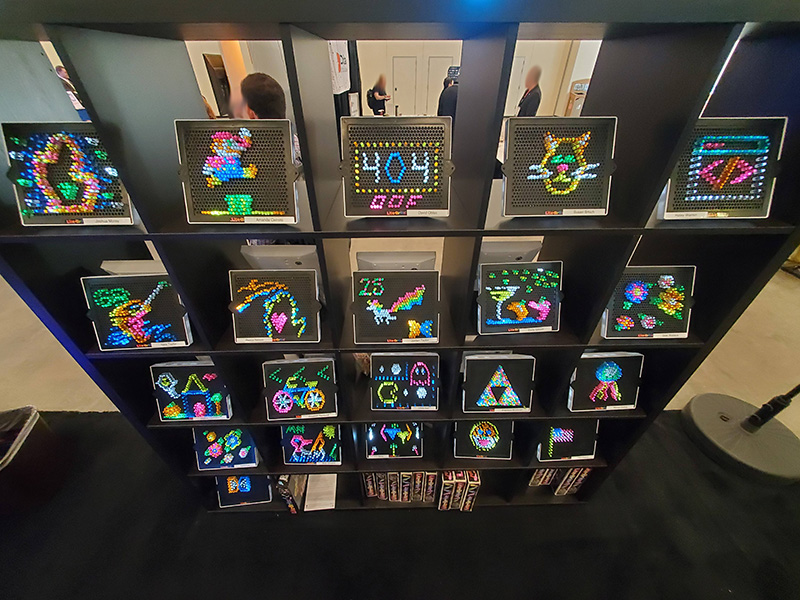 A Lite Brite showcase with 25 completed artworks, with the camera lens