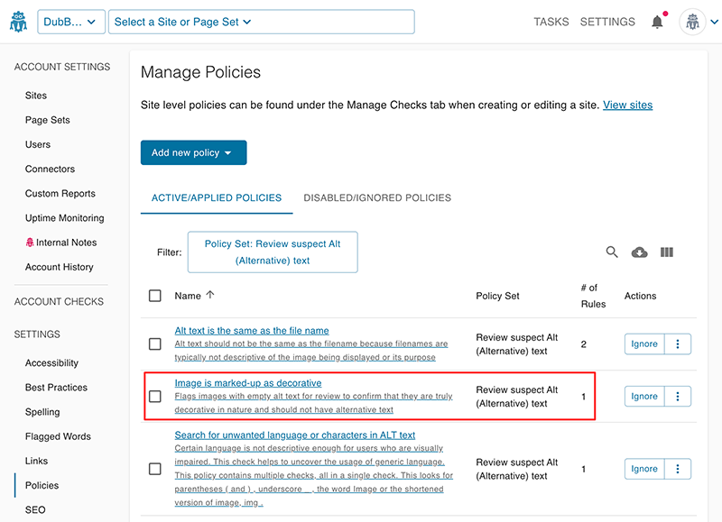 A DubBot custom policy can surface every image marked as decorative across your site, making it easier to confirm which images are truly decorative and which may, indeed, require descriptive ALT text.