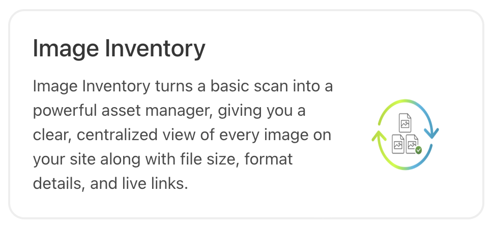All the feature boxes on the Features index page are links. The image to the right of the text in each box is part of the link and is clickable. It provides no additional information about the link. The text in the box explains the purpose of the link. In this example, the text explains what Image Inventory is and how it benefits our clients.